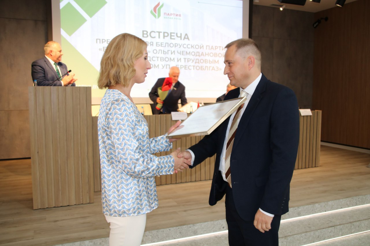 19 августа 2025г. Председатель Белорусской партии «Белая Русь» Чемоданова Ольга Николаевна за активное участие в общественно-политической деятельности и значительный личный вклад в развитие партийного строительства вручила Благодарственное письмо заместителю директора по идеологической работе, кадрам и безопасности ОАО "БЭМЗ".